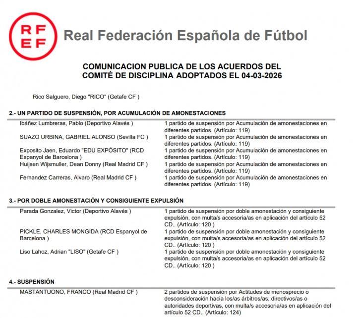 由于吕迪格没有出现在判罚名单当中,关于西甲裁判偏袒皇马的话题也被更多球迷讨论,虽然皇马多次表达了对判罚的不满,但是包括吕迪格膝击对手,巴尔韦德挥拳击打对手在内的皇马球员多次犯规也都没有得到应有的处罚,自然也引发了球迷的讨论和不满。在这份名单当中,看起来是皇马三名球员被禁赛,但其实真正遭遇禁赛的只有18岁的马斯坦托诺,赫伊森和卡拉雷斯都是因为累计黄牌才停赛的。