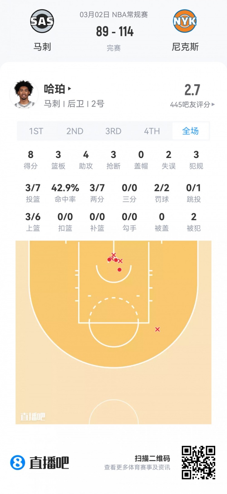 马刺首轮14号秀卡特·布莱恩特 登场3.6分钟